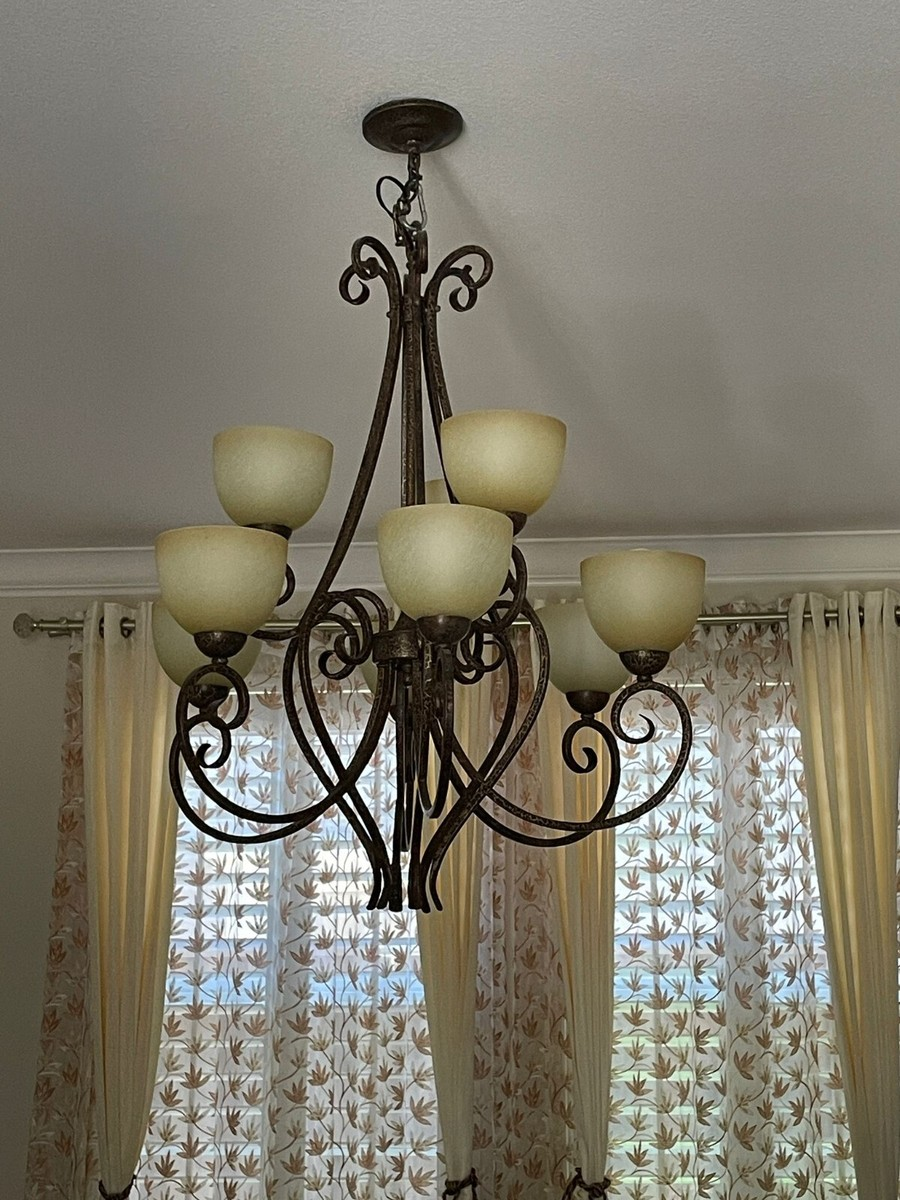 Elevate your dining area with our rustic chandelier, crafted with wrought iron accents and candelabra lights to create a cozy and inviting ambiance for family gatherings or dinner parties.